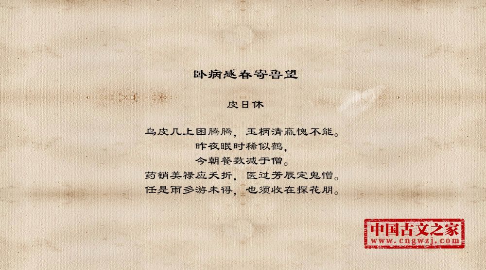皮日休,字袭美,一字逸少,生于公元834至839年间,卒于公元902年以后。曾居住在鹿门山,自号鹿门子,又号间气布衣、醉吟先生。晚唐文学家、散文家,与