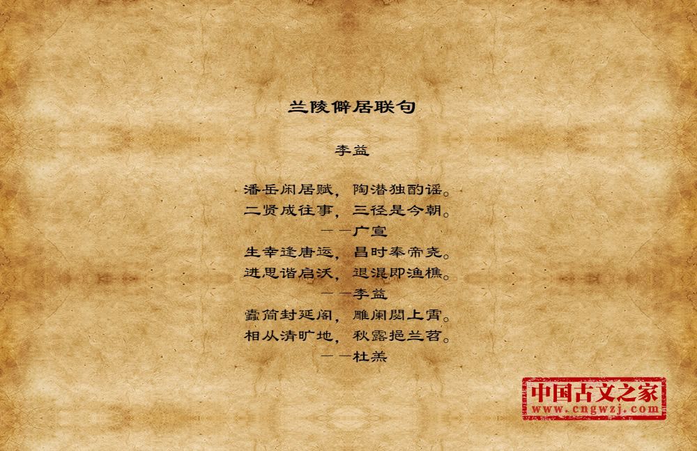 潘岳闲居赋,陶潜独酌谣。二贤成往事,三径是今朝。——广宣生幸逢唐运,昌时奉帝尧。进思谐启沃,退混即渔樵。——李益蠹简封延阁,雕阑閟上霄。相从清旷地,秋露挹兰苕。——杜羔