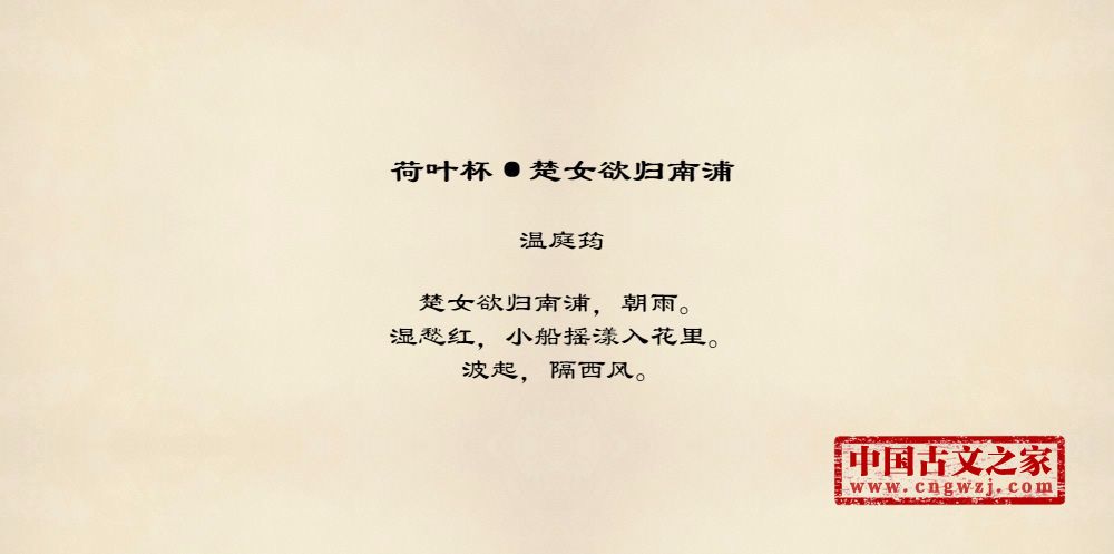 楚女欲归南浦,朝雨。湿愁红,小船摇漾入花里。波起,隔西风。