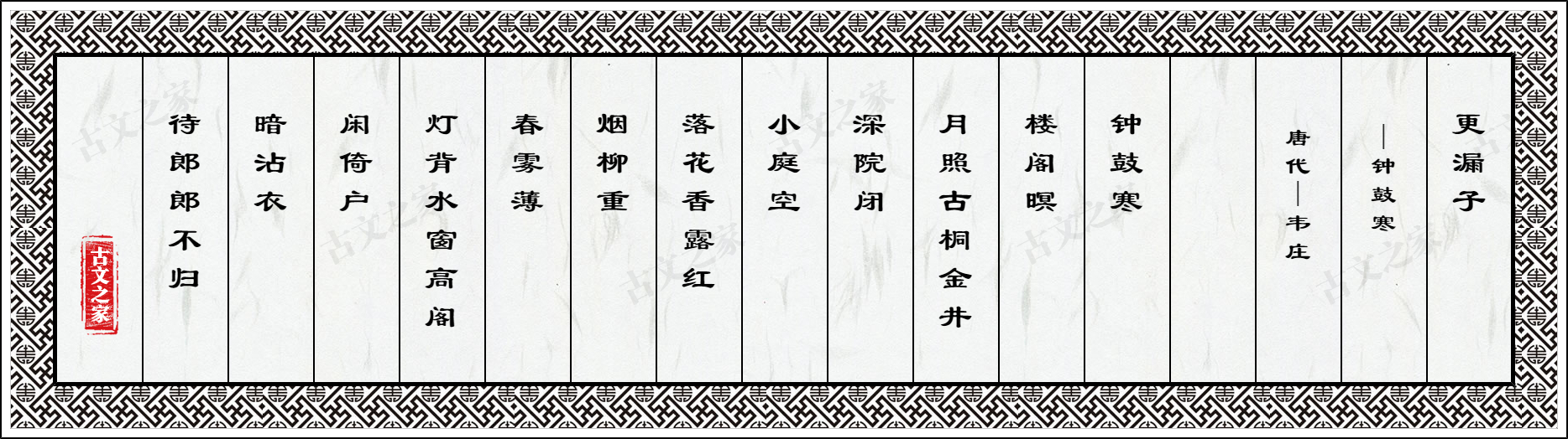 钟鼓寒,楼阁暝,月照古桐金井。深院闭,小庭空,落花香露红。