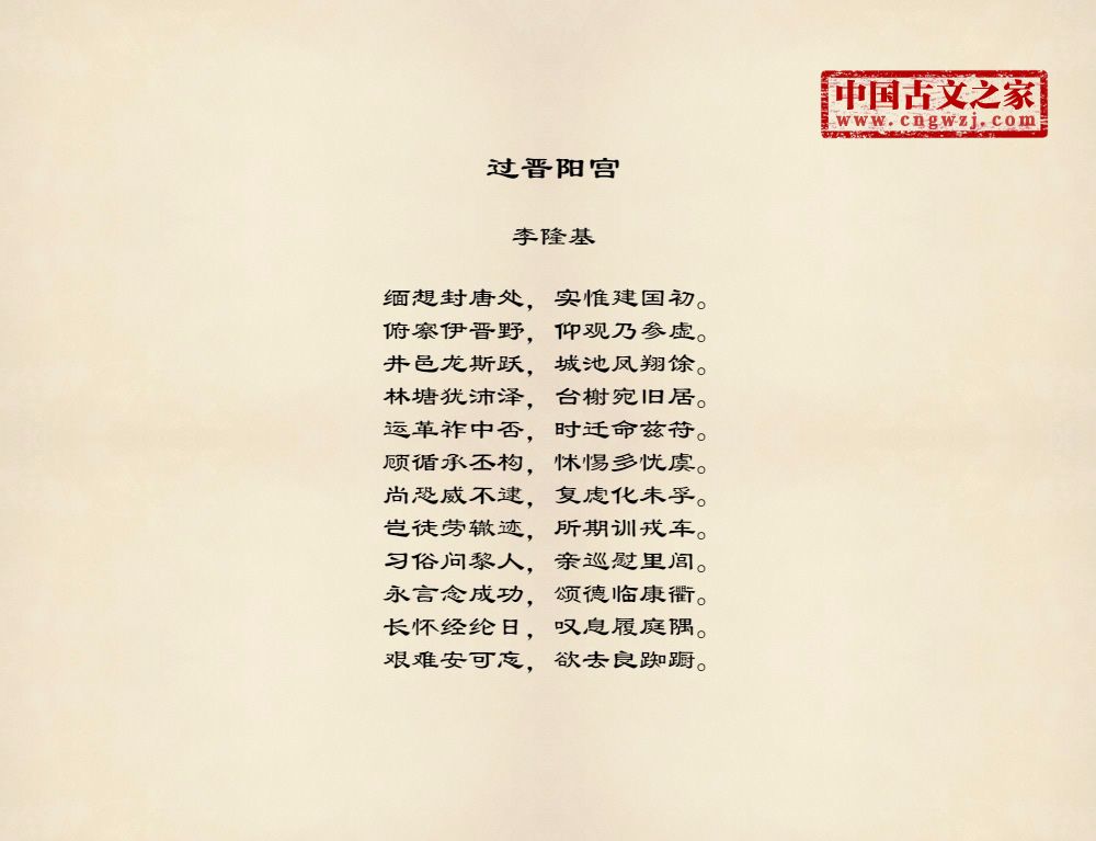缅想封唐处,实惟建国初。俯察伊晋野,仰观乃参虚。井邑龙斯跃,城池凤翔馀。林塘犹沛泽,台榭宛旧居。运革祚中否,时迁命兹符。顾循承丕构,怵惕多忧虞。尚恐威不逮,复虑化未孚。岂徒劳辙迹,所期训戎车。习俗问黎人,亲巡慰里闾。永言念成功,颂德临康衢。长怀经纶日,叹息履庭隅。艰难安可忘,欲去良踟蹰。