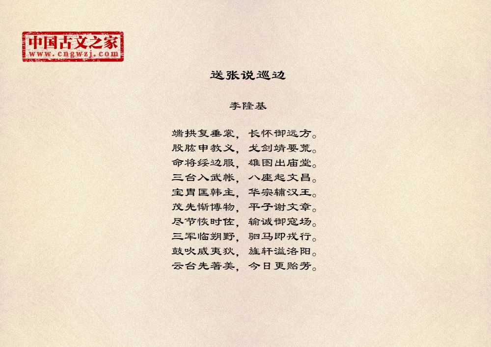 端拱复垂裳,长怀御远方。股肱申教义,戈剑靖要荒。命将绥边服,雄图出庙堂。三台入武帐,八座起文昌。宝胄匡韩主,华宗辅汉王。茂先惭博物,平子谢文章。尽节恢时佐,输诚御寇场。三军临朔野,驷马即戎行。鼓吹威夷狄,旌轩溢洛阳。云台先著美,今日更贻芳。