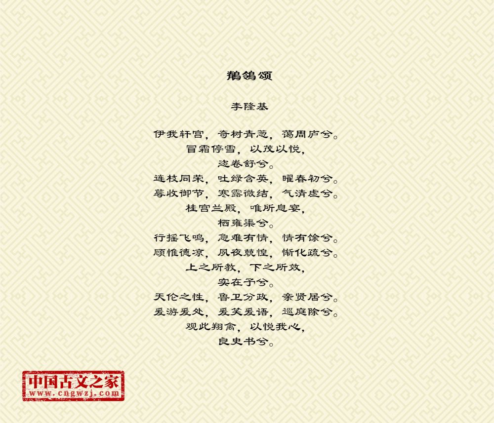 伊我轩宫,奇树青葱,蔼周庐兮。冒霜停雪,以茂以悦,恣卷舒兮。连枝同荣,吐绿含英,曜春初兮。蓐收御节,寒露微结,气清虚兮。桂宫兰殿,唯所息宴,栖雍渠兮。行摇飞鸣,急难有情,情有馀兮。顾惟德凉,夙夜兢惶,惭化疏兮。上之所教,下之所效,实在予兮。天伦之性,鲁卫分政,亲贤居兮。爰游爰处,爰笑爰语,巡庭除兮。观此翔禽,以悦我心,良史书兮。