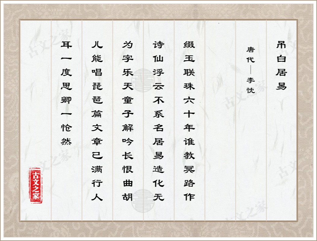 你的名声传遍大唐天下,你的诗作让子孙后代引以为傲,连孩童都能背诵《长恨歌》,胡人也会哼唱《琵琶行》。
