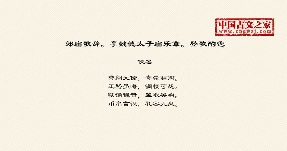 《郊庙歌辞。享懿德太子庙乐章。登歌酌鬯》由佚名创作
