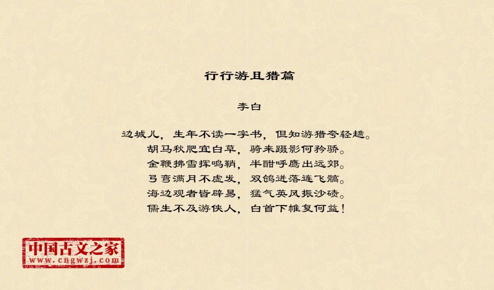 ⑴《行行且游猎篇》,是乐府“征戌”十五曲中的“校猎曲”,一般写帝王游猎的事情。这里借以赞扬边城儿的矫健。