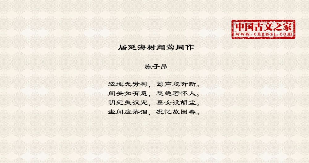边地无芳树,莺声忽听新。间关如有意,愁绝若怀人。明妃失汉宠,蔡女没胡尘。坐闻应落泪,况忆故园春。