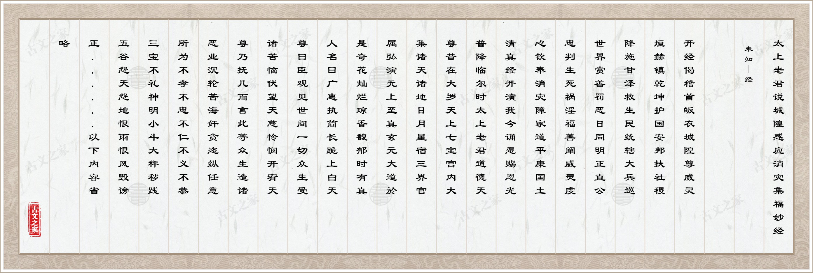 虔心钦奉消灾障,家道平康国土清。真经开演我今诵,愿赐恩光普降临。