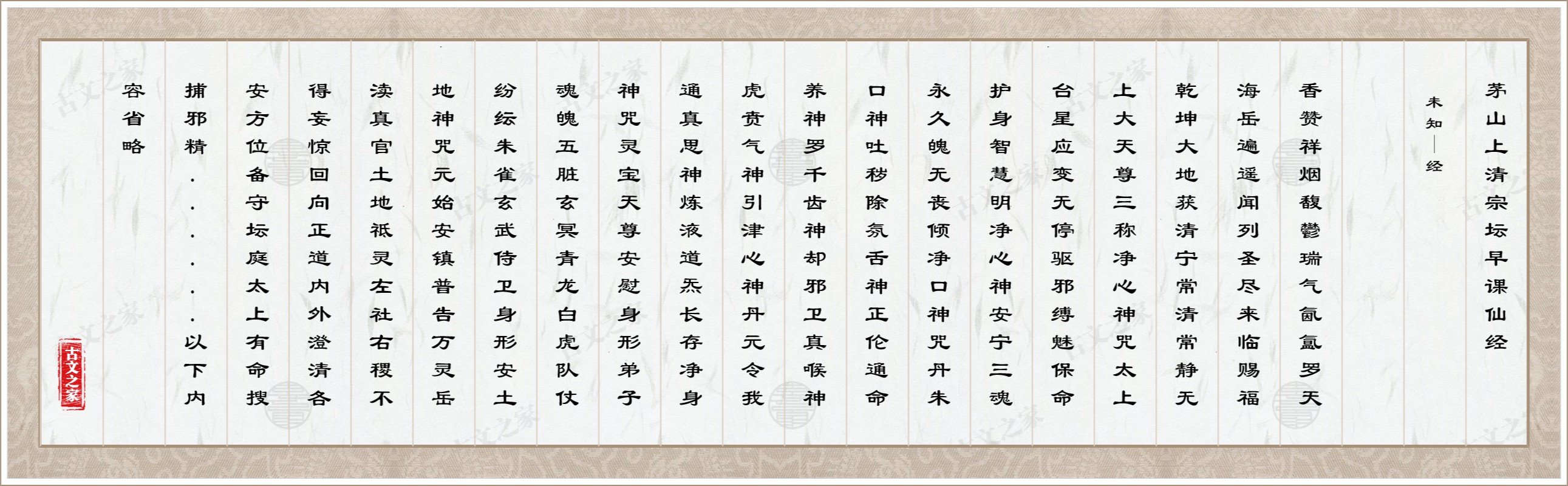 云篆太虚。浩劫之初。乍遐乍迩。或沉或浮。五方徘徊。一丈之余。天真皇人。按笔乃书。以演洞章。次书灵符。元始下降。真文诞敷。昭昭其有。冥冥其无。沉疴能自全。尘劳溺可扶。幽冥将有赖。由是升仙都。