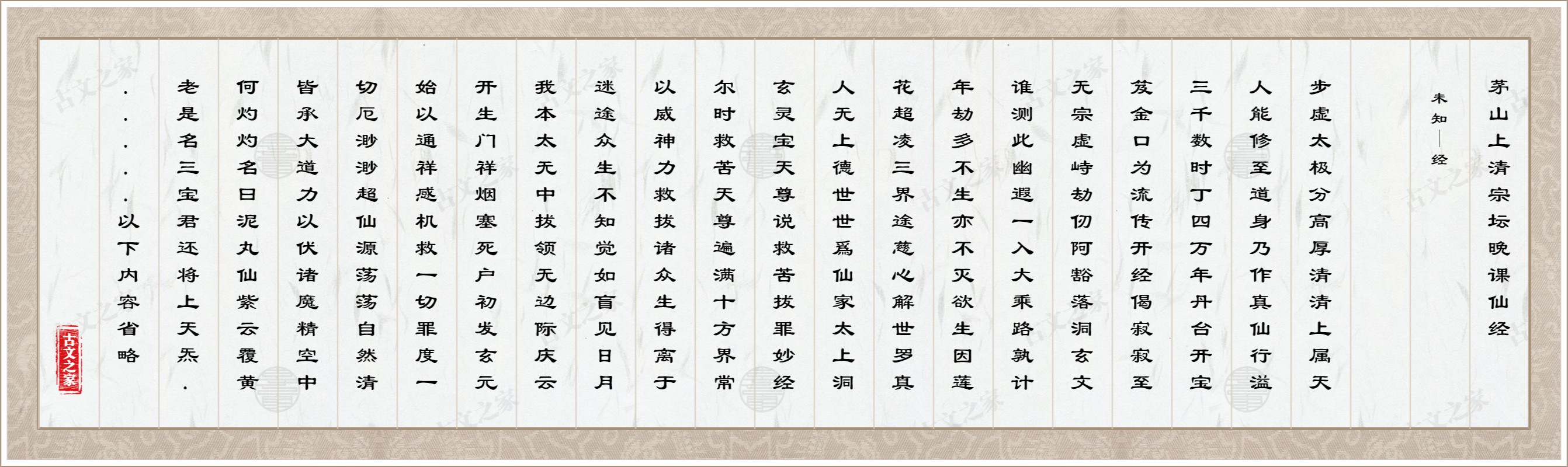 寂寂至无宗,虚峙劫仞阿。豁落洞玄文,谁测此幽遐。一入大乘路,孰计年劫多。不生亦不灭,欲生因莲花。超凌三界途。慈心解世罗,真人无上德,世世爲仙家。