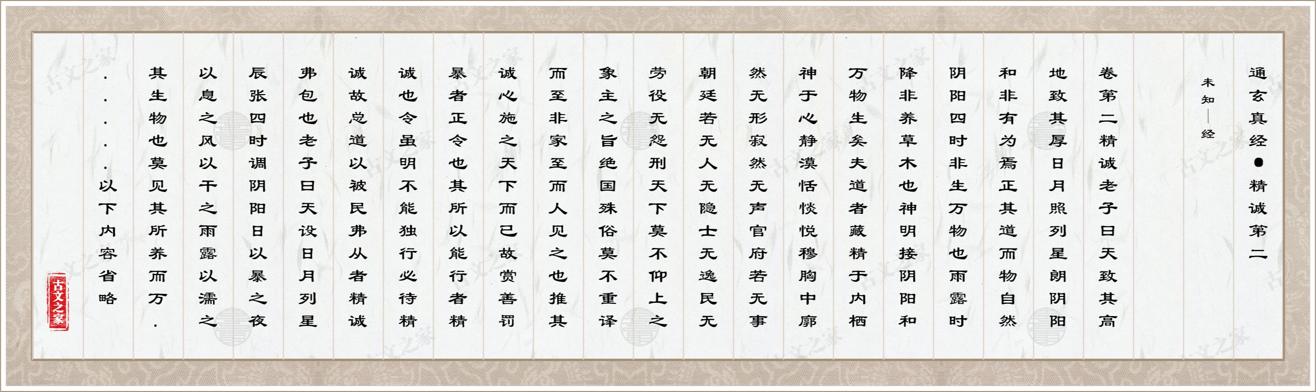 老子曰:天致其高,地致其厚,日月照,列星朗,阴阳和,非有为焉,正其道而物自然。阴阳四时非生万物也,雨露时降非养草木也,神明接,阴阳和,万物生矣。夫道者,藏精于内,栖神于心,静漠恬惔,悦穆胸中,廓然无形,寂然无声。官府若无事,朝廷若无人,无隐士,无逸民,无劳役,无怨刑,天下莫不仰上之象,主之旨,绝国殊俗莫不重译而至,非家至而人见之也,推其诚心,施之天下而已。故赏善罚暴者,正令也;其所以能行者,精诚也。令虽明不能独行,必待精诚,故总道以被民弗从者,精诚弗包也。