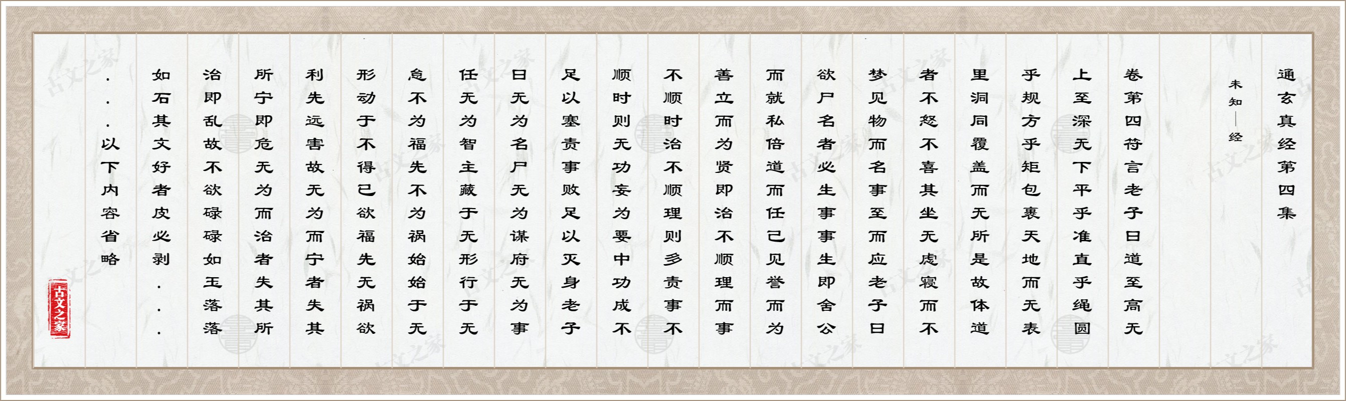 老子曰:圣人无屈奇之服,诡异之行,服不杂,行不观,通而不华,穷而不慑,荣而不显,隐而不辱,异而不怪,同用无以名之,是谓大通。