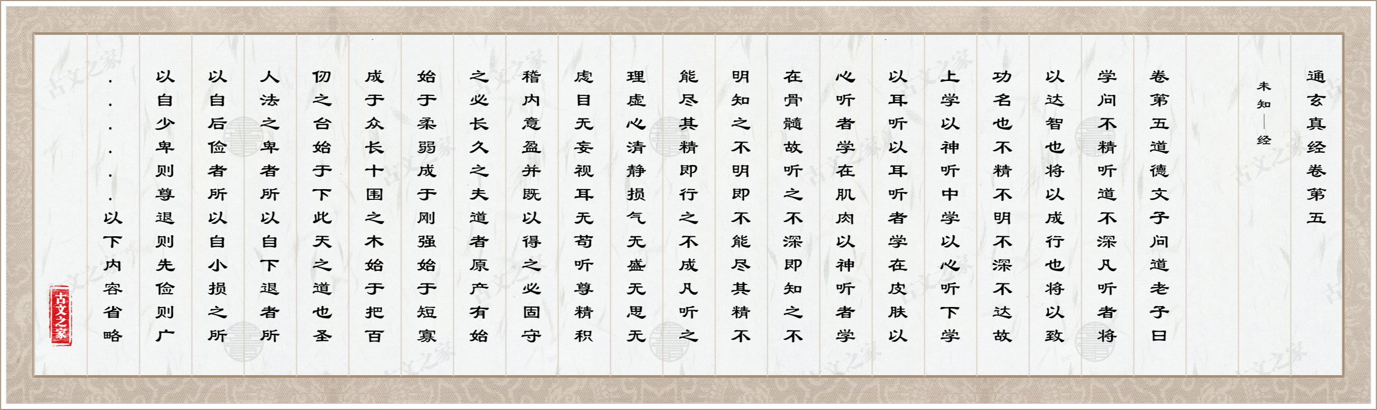 文子问道。老子曰:学问不精,听道不深。凡听者,将以达智也,将以成行也,将以致功名也,不精不明,不深不达。故上学以神听,中学以心听,下学以耳听,以耳听者,学在皮肤,以心听者,学在肌肉,以神听者,学在骨髓。故听之不深,即知之不明,知之不明,即不能尽其精,不能尽其精,即行之不成。凡听之理,虚心清静,损气无盛,无思无虑,目无妄视,耳无苟听,尊精积稽,内意盈并,既以得之,必固守之,必长久之。夫道者,原产有始,始于柔弱,成于刚强,始于短寡,成于众长,十围之木始于把,百仞之台始于下,此天之道也。圣人法之,卑者所以自下,退者所以自后,俭者所以自小,损之所以自少,卑则尊,退则先,俭则广,损则大,此天道所成也。夫道者,德之元,大之根,福之门,万物待之而生,待之而成,待之而宁。夫道,无为无形,内以修身,外以治人,功成事立,与天为邻,无为而无不为,莫知其情,莫知其真,其中有信。天子有道则天下服,长有社稷,公侯有道则人民和睦,不失其国,士庶有道则全其身,保其亲,强大有道,不战而克,小弱有道,不争而得,举事有道,功成得福,君臣有道则忠惠,父子有道则慈孝,士庶有道则相爱,故有道则知,无道则苛。由是观之,道之于人,无所不宜也。夫道者,小行之小得福,大行之大得福,尽行之天下服,服则怀之,故帝者,天下之适也,王者,天下之往也,天下不适不往,不可谓帝王。故帝王不得人不能成,得人失道亦不能守。夫失道者,奢泰骄佚,慢倨矜傲,见余自显自明,执雄坚强,作难结怨,为兵主,为乱首,小人行之,身受大殃,大人行之,国家灭亡,浅及其身,深及子孙,夫罪莫大于无道,怨莫深于无德,天道然也。