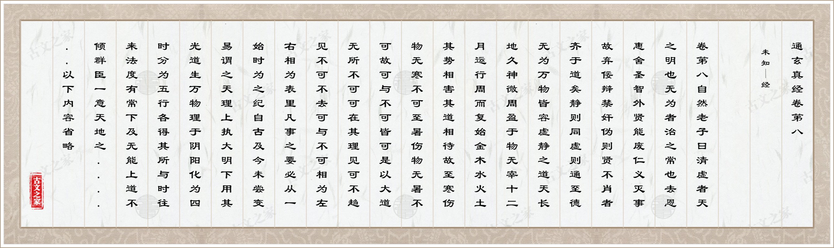 老子曰:清虚者,天之明也,无为者,治之常也,去恩惠,舍圣智,外贤能,废仁义,灭事故,弃佞辩,禁奸伪,则贤不肖者齐于道矣。静则同,虚则通,至德无为,万物皆容,虚静之道,天长地久,神微周盈,于物无宰。十二月运行,周而复始,金木水火土,其势相害,其道相待。故至寒伤物,无寒不可,至暑伤物,无暑不可,故可与不可皆可,是以大道无所不可,可在其理,见可不趋,见不可不去,可与不可,相为左右,相为表里。凡事之要,必从一始,时为之纪,自古及今,未尝变易,谓之天理。上执大明,下用其光,道生万物,理于阴阳,化为四时,分为五行,各得其所,与时往来,法度有常,下及无能,上道不倾,群臣一意,天地之道无为而备,无求而得,“是以知其无为而有益也。”