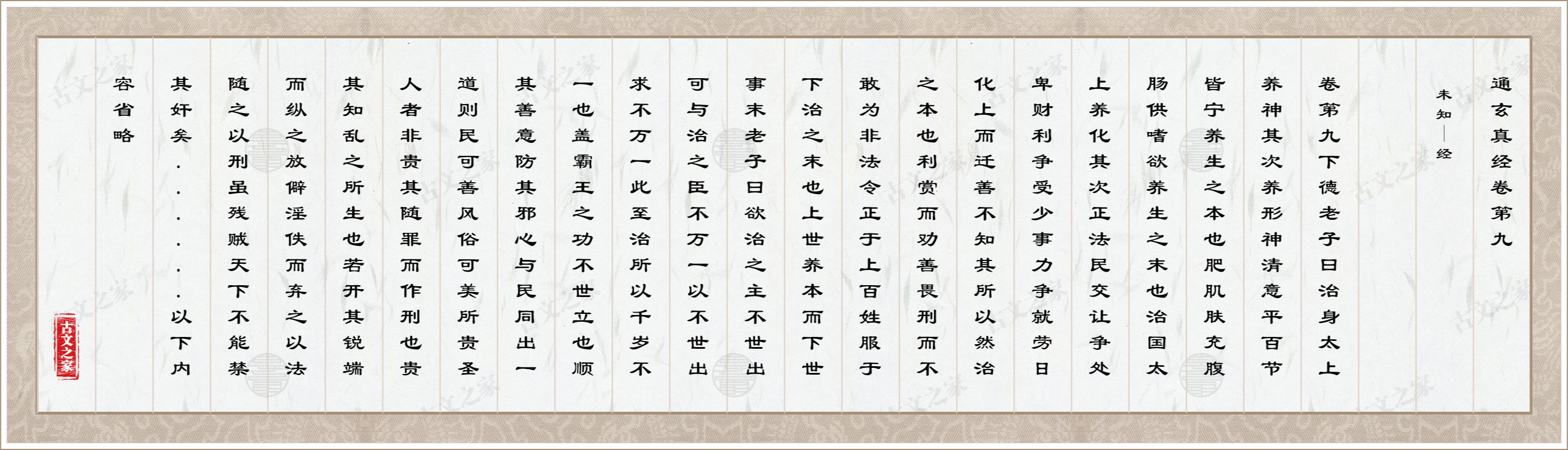 老子曰:治身,太上养神,其次养形,神清意平,百节皆宁,养生之本也,肥肌肤,充腹肠,供嗜欲,养生之末也。治国,太上养化,其次正法,民交让争处卑,财利争受少,事力争就劳,日化上而迁善,不知其所以然,治之本也,利赏而劝善,畏刑而不敢为非,法令正于上,百姓服于下,治之末也,上世养本,而下世事末。