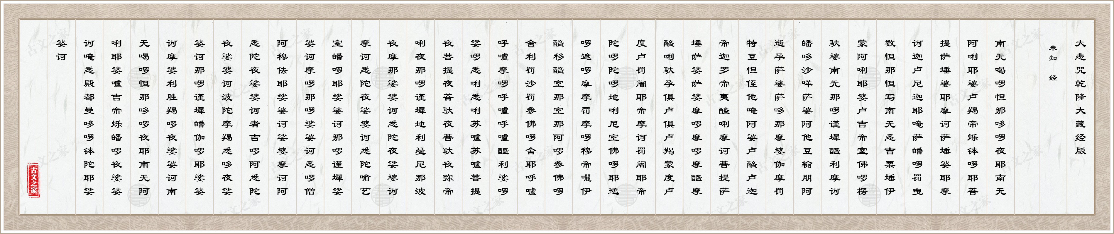 南无喝啰怛那哆啰夜耶。南无阿唎耶。婆卢羯帝烁钵啰耶。菩提萨埵婆耶。摩诃萨埵婆耶。摩诃迦卢尼迦耶。唵。萨皤啰罚曳。数怛那怛写。南无悉吉栗埵伊蒙阿唎耶。婆卢吉帝室佛啰楞驮婆。南无那啰谨墀。醯利摩诃皤哆沙咩。萨婆阿他豆输朋。阿逝孕。萨婆萨哆那摩婆伽。摩罚特豆。怛侄他。唵阿婆卢醯。卢迦帝。迦罗帝。夷醯唎。摩诃菩提萨埵。萨婆萨婆。摩啰摩啰。摩醯摩醯唎驮孕。俱卢俱卢羯蒙。度卢度卢罚阇耶帝。摩诃罚阇耶帝。陀啰陀啰。地唎尼。室佛啰耶。遮啰遮啰。摩摩罚摩啰。穆帝囇。伊醯移醯。室那室那。阿啰参佛啰舍利。罚沙罚参。佛啰舍耶。呼嚧呼嚧摩啰。呼嚧呼嚧醯利。娑啰娑啰。悉唎悉唎。苏嚧苏嚧。菩提夜菩提夜。菩驮夜菩驮夜。弥帝唎夜。那啰谨墀。地利瑟尼那。波夜摩那。娑婆诃。悉陀夜。娑婆诃。摩诃悉陀夜。娑婆诃。悉陀喻艺。室皤啰耶。娑婆诃。那啰谨墀。娑婆诃。摩啰那啰。娑婆诃。悉啰僧阿穆佉耶。娑婆诃。娑婆摩诃阿悉陀夜。娑婆诃。者吉啰阿悉陀夜。娑婆诃。波陀摩羯悉哆夜。娑婆诃。那啰谨墀皤伽啰耶。娑婆诃。摩婆利胜羯啰夜。娑婆诃。南无喝啰怛那哆啰夜耶。南无阿唎耶。婆嚧吉帝。烁皤啰夜。娑婆诃。唵悉殿都。曼哆啰。钵陀耶。娑婆诃。