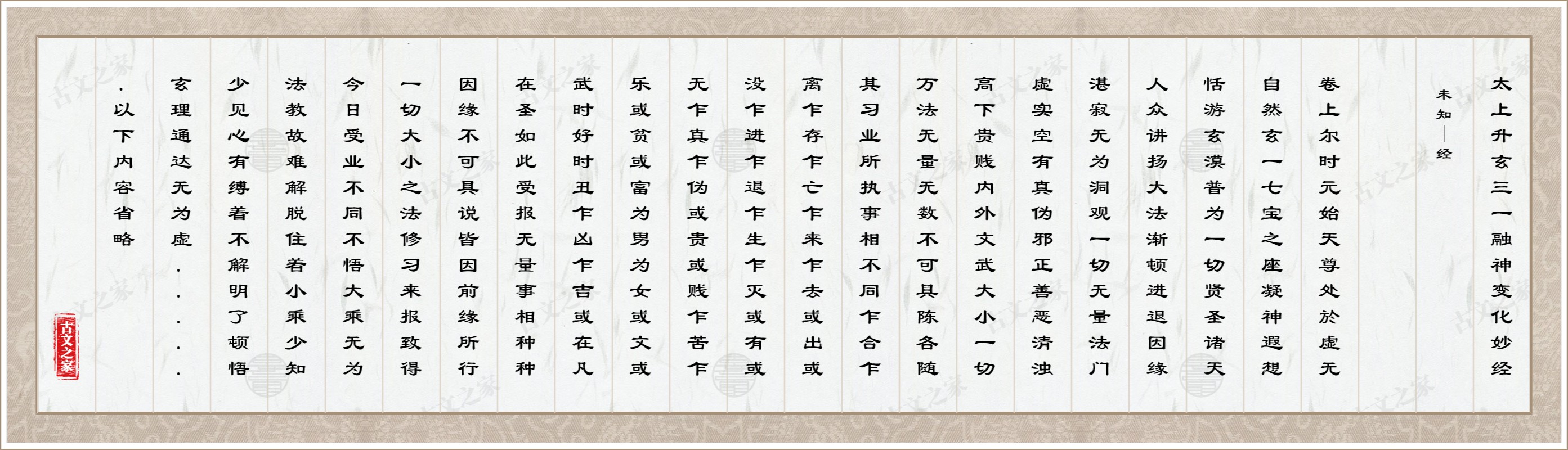尔时元始天尊告玄一道君曰:善哉善哉,汝今发问,至要无上。大法因缘,甚为深妙,难可思议。汝等复座谛听,吾为汝说无上大法、成就一切无量法门。有成有败,有生有灭,有出有没,有进有退,有是有非,有好有恶,有长有短,有愚有智,有明有暗,良由过去习业不同。修行小法,为道枝叶。所修一切功德,暂得人天福报,因缘报尽,还归磨灭,不免轮回六道,受诸报对,善恶之事不停,生生复死,死死复生,经历生死,造善造恶,报对无穷无尽,难得解脱。无有大法胜缘,拔度顿得,舍离一切业道,去离三恶五道、九幽八难、三涂五苦,超出三界之上,度脱生死之道。解脱无为,所修一切有为法教,福报有尽,还归破坏磨灭,泥土同法。不得正真解脱,良由心智不达,执系有为希求,功报若尽,还归散坏。如此辛苦,不免无常变化,随其来业流浪,不得自在,被他拘系,无有休息。若夫大士上智,了达玄悟道性之人,所修一切功德,不希功报,心无取着,我所修一切有为功德者,唯将显明事相,坚持法教,引导愚人,令其出离解脱,渐得利益,进入法门。赖此功德,福善庄严,以道结缘。所修一切因果,以保命根,求生受报功德因缘,唯我作导师,於其中间,引化种种事相因缘,并将舍施一切,天地神祇,拔度六道、过去九玄七祖、一切先亡、罪恶众生,令出苦海,进入道门,俱得解脱。唯我独守无为,归根反本,静我神识清净气性,护我身心。内无所起,外无所染,心无所住,遍行圆满。不依一法而生法相,不住一法而生系缚。不起一念,欲求福报,功德因缘。我所行学,状若无修;我所云为,作诸功德。喻若无福,不敢希报,回施一切人天世界。唯愿以此功德,散备一切,六道福善,庄严与我,同得解脱,齐入至真,俱登道岸。
