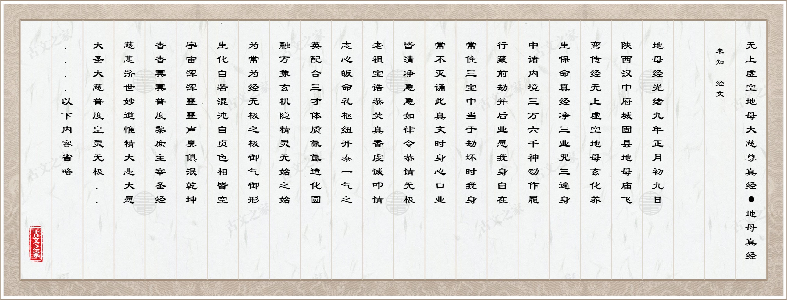 地母化生。普天肃静。河海净默。山岳吞云。万灵扳扶。召集群真。天无杂气。地无妖魔。明慧洞清。大道玄玄。虚空地母。无量慈尊。奉劝世人。虔诵地母经。