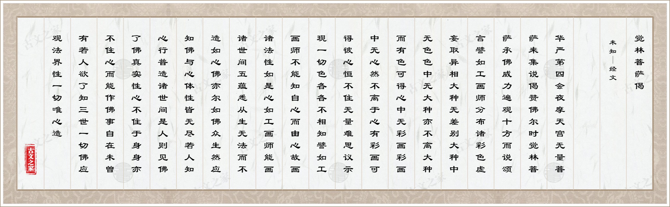 华严第四会,夜摩天宫,无量菩萨来集,说偈赞佛。尔时觉林菩萨,承佛威力,遍观十方,而说颂言:譬如工画师,分布诸彩色,虚妄取异相,大种无差别。大种中无色,色中无大种,亦不离大种,而有色可得。心中无彩画,彩画中无心,然不离于心,有彩画可得。彼心恒不住,无量难思议,示现一切色,各各不相知。譬如工画师,不能知自心,而由心故画,诸法性如是。心如工画师,能画诸世间,五蕴悉从生,无法而不造。如心佛亦尔,如佛众生然,应知佛与心,体性皆无尽。若人知心行,普造诸世间,是人则见佛,了佛真实性。心不住于身,身亦不住心,而能作佛事,自在未曾有。若人欲了知,三世一切佛,应观法界性,一切唯心造。