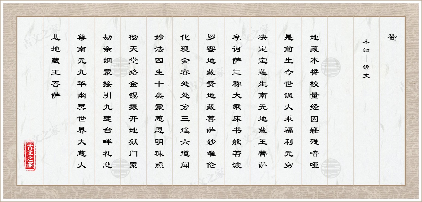 地藏本誓,校量经因,癃残喑哑是前生,今世讽大乘,福利无穷,决定宝莲生。