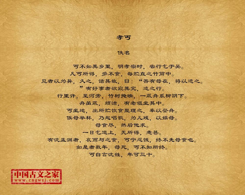 一位名叫沈孟渊的人见他可怜,送他食物,但乞丐宁愿自己挨饿,也要先让母亲吃。