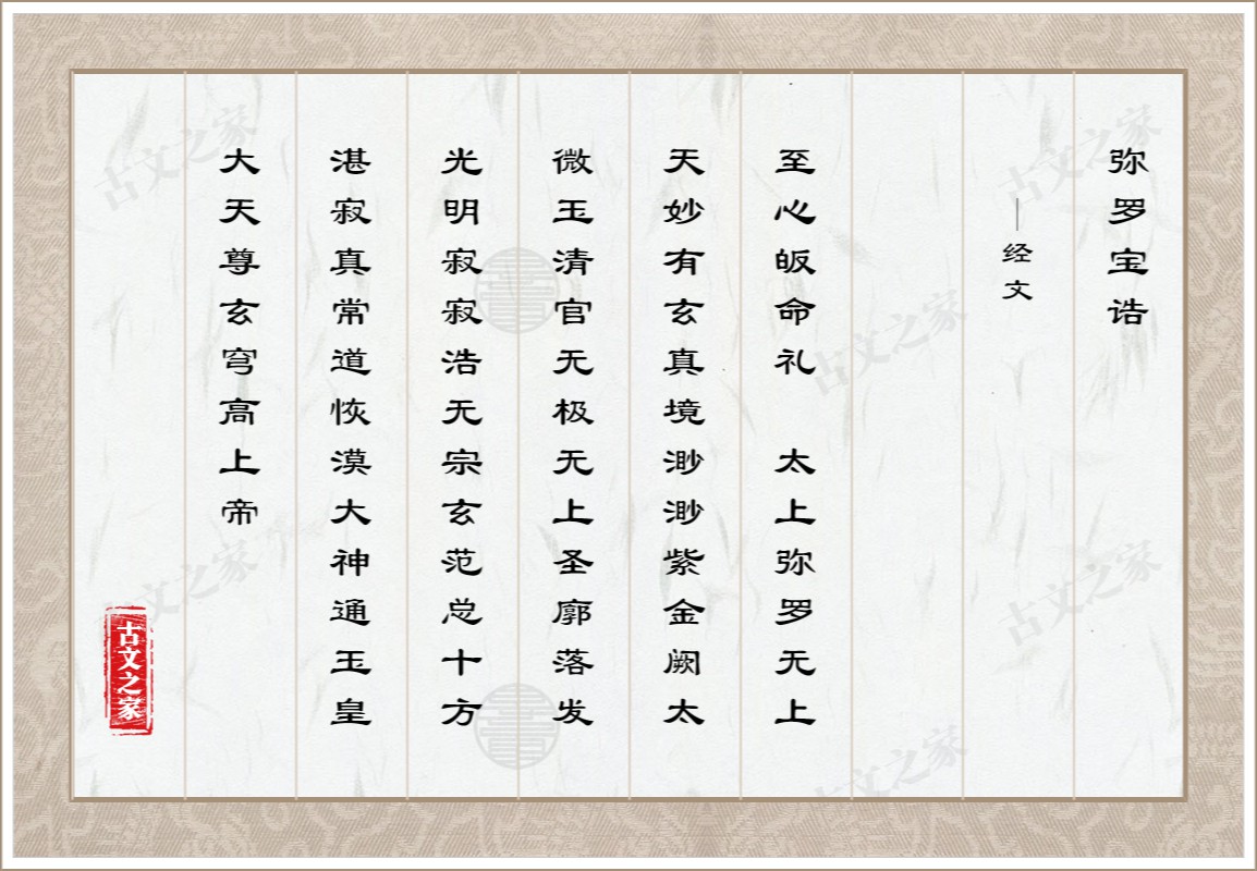 太上弥罗无上天,妙有玄真境。渺渺紫金阙,太微玉清官。无极无上圣,廓落发光明。寂寂浩无宗,玄范总十方。湛寂真常道,恢漠大神通。玉皇大天尊,玄穹高上帝。
