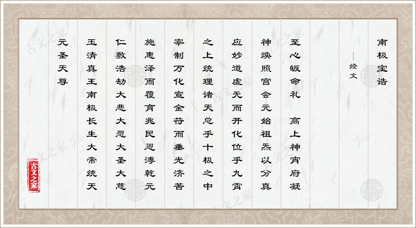 高上神宵府,凝神焕照宫。会元始祖炁以分真,应妙道虚无而开化。位乎九霄之上,统理诸天。总乎十极之中,宰制万化。宣金符而垂光济苦,施惠泽而覆育兆民。恩溥乾元,仁敷浩劫。大悲大愿,大圣大慈。玉清真王,南极长生大帝,统天元圣天尊。