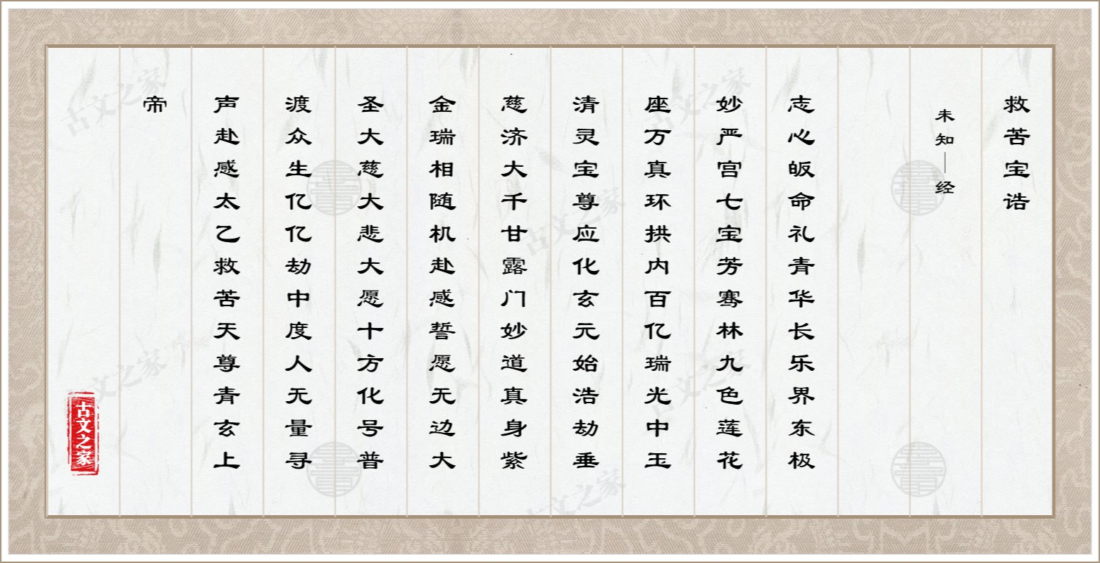志心皈命礼。青华长乐界,东极妙严宫,七宝芳骞林,九色莲花座,万真环拱内,百亿瑞光中,玉清灵宝尊,应化玄元始,浩劫垂慈济,大千甘露门,妙道真身,紫金瑞相,随机赴感,誓愿无边,大圣大慈,大悲大愿,十方化号,普渡众生,亿亿劫中,度人无量,寻声赴感,太乙救苦天尊。青玄上帝。