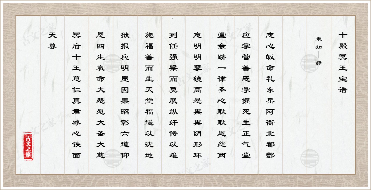 东岳阿衡,北都酆应。掌管善恶,掌握死生。正气堂堂,亲跻一律。圣心耿耿,恩怨两忘。明明孽镜高悬,黑黑阴形环列。任强梁而莫展,纵奸佞以难施。福善而生天堂,福遥以沈地狱。报应明显,因果昭彰。六道仰恩,四生哀命。大悲愿,大圣大慈,冥府十王,慈仁真君,冰心铁面天尊。