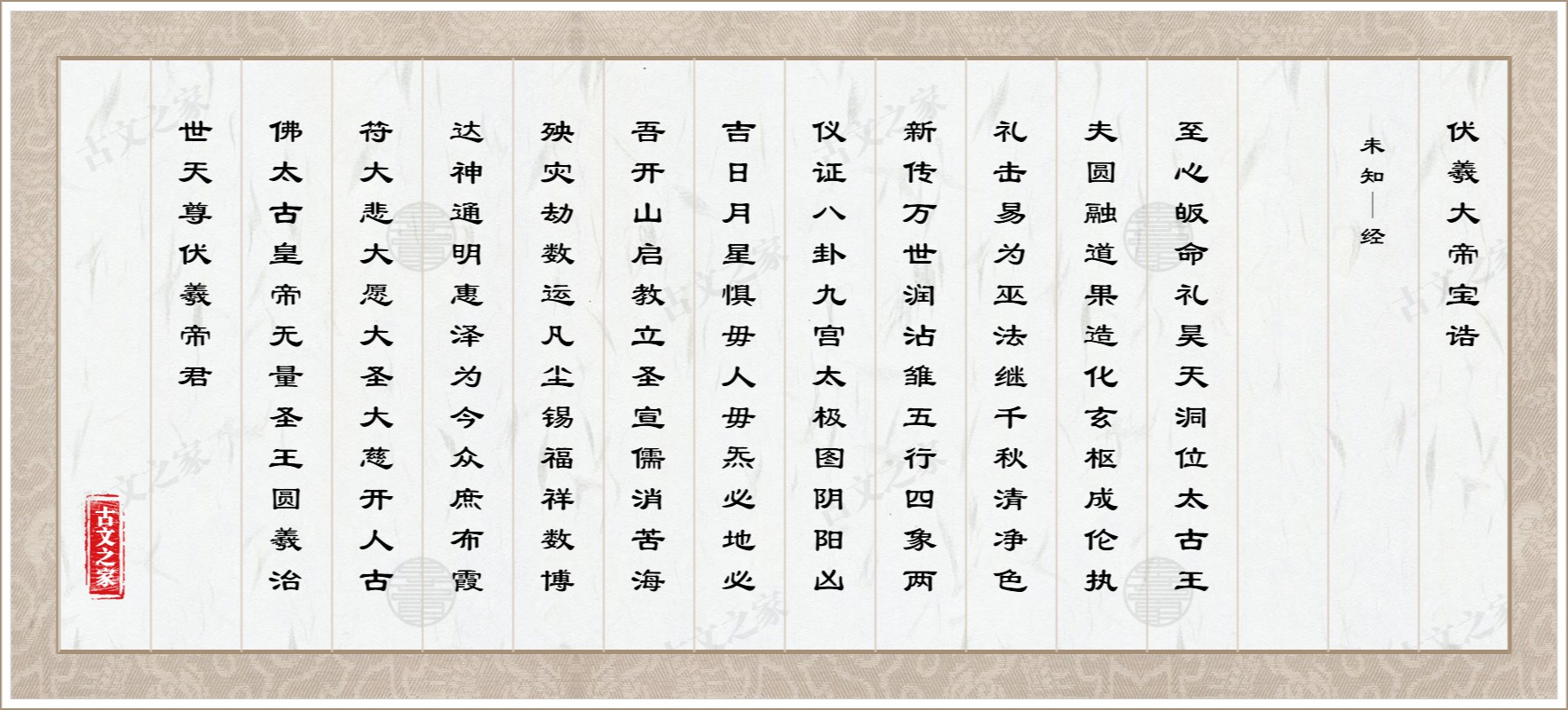 昊天洞位,太古王夫。圆融道果,造化玄枢。成伦执礼,击易为巫。法继千秋清净色,新传万世润沾雏;五行四象两仪证,八卦九宫太极图。阴阳凶吉,日月星惧。毋人毋炁,必地必吾;开山启教,立圣宣儒。消苦海殃灾劫数,运凡尘锡福祥数;博达神通明惠泽,为今众庶布霞符。大悲大愿,大圣大慈,开人古佛,太古皇帝;无量圣王,圆羲治世天尊,伏羲帝君。