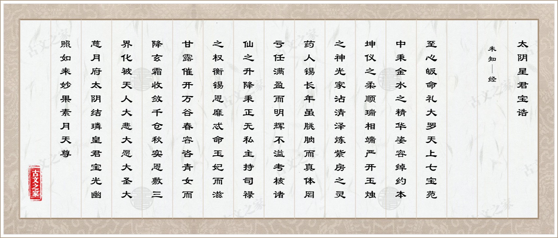 大罗天上,七宝苑中。秉金水之精华,姿容绰约。本坤仪之柔顺,瑞相端严。开玉烛之神光,家沾清泽。炼紫房之灵药,人锡长年。虽朓朒而真体罔亏,任满盈而明辉不溢。考核诸仙之升降,秉正无私。主持司禄之权衡,锡恩靡忒。命玉妃而滋甘露,催开万谷春容。咨青女而降玄霜,收敛千仓秋实。恩敷三界,化被天人。大悲大愿,大圣大慈,月府太阴结璘皇君,宝光幽照如来妙果素月天尊。
