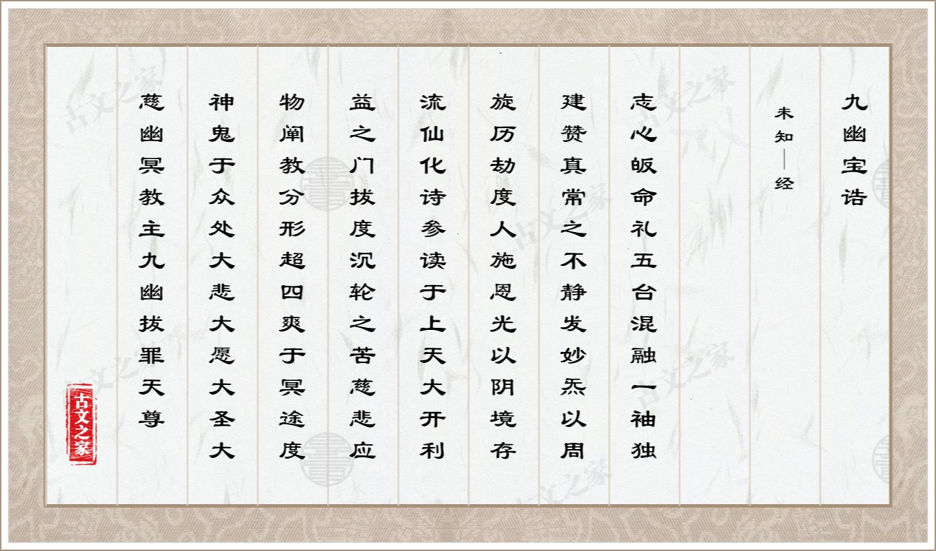 五台混融,一袖独建。赞真常之不静,发妙炁以周旋。历劫度人,施恩光以阴境;存流仙化,诗参读于上天。大开利益之门,拔度沉轮之苦。慈悲应物,阐教分形。超四爽于冥途,度神鬼于众处。大悲大愿,大圣大慈。幽冥教主,九幽拔罪天尊。