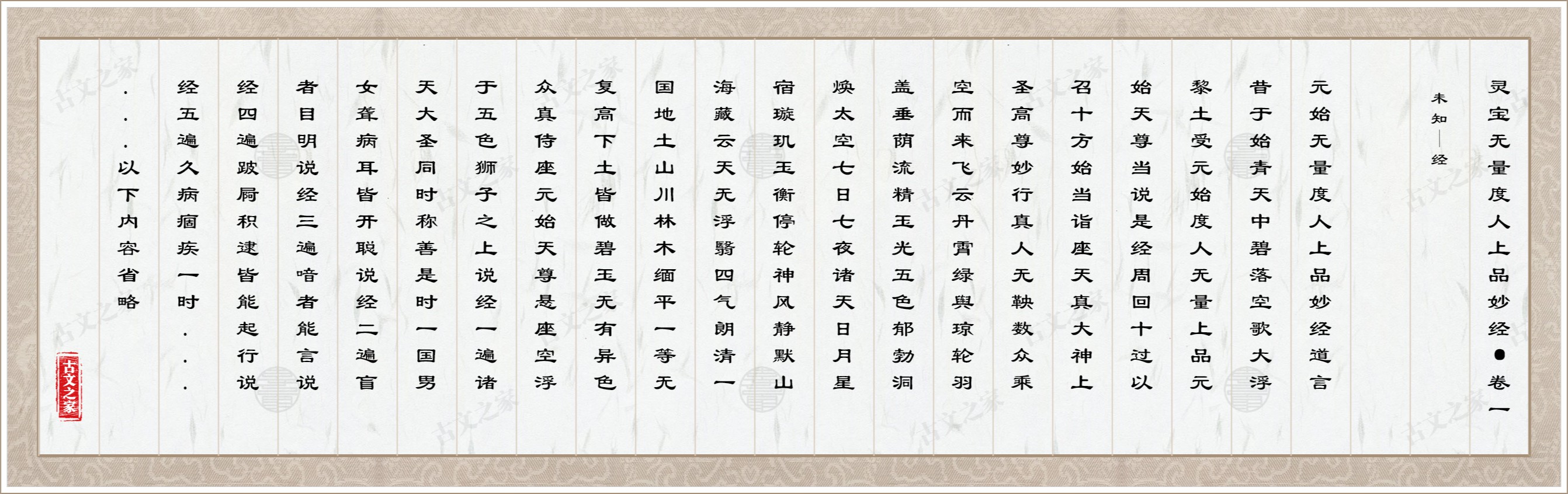 元洞玉历,龙汉延康,渺渺亿劫,浑沌之中,上无复色,下无复渊,风泽洞虚,金刚乘天,天上天下,无幽无冥,无形无影,无极无穷,溟涬大梵,寥廓无光,赤明开图,运度自然,元始安镇,敷落五篇,赤书玉字,八威龙文,保制劫运,使天长存,梵气弥罗,万梵开张,元纲流演,三十二天,轮转无色,周回十方,旋斗历箕,回度五常,三十五分,总气上元,八景冥合,气入玄玄,玄中太皇,上帝高真,泛景太霞,啸咏洞章,金真朗郁,流响云营,玉音摄气,灵风聚烟,紫虚郁秀,辅翼万仙,千和万合,自然成真。真中有神,长生大君,无英公子,白元尊神,太一司命,桃康合延,执符把箓,保命生根,上游上清,出入华房,八冥之内,细微之中,下镇人身,泥丸绛宫,中理五气,混合百神,十转回灵,万气齐仙,仙道贵生,无量度人。