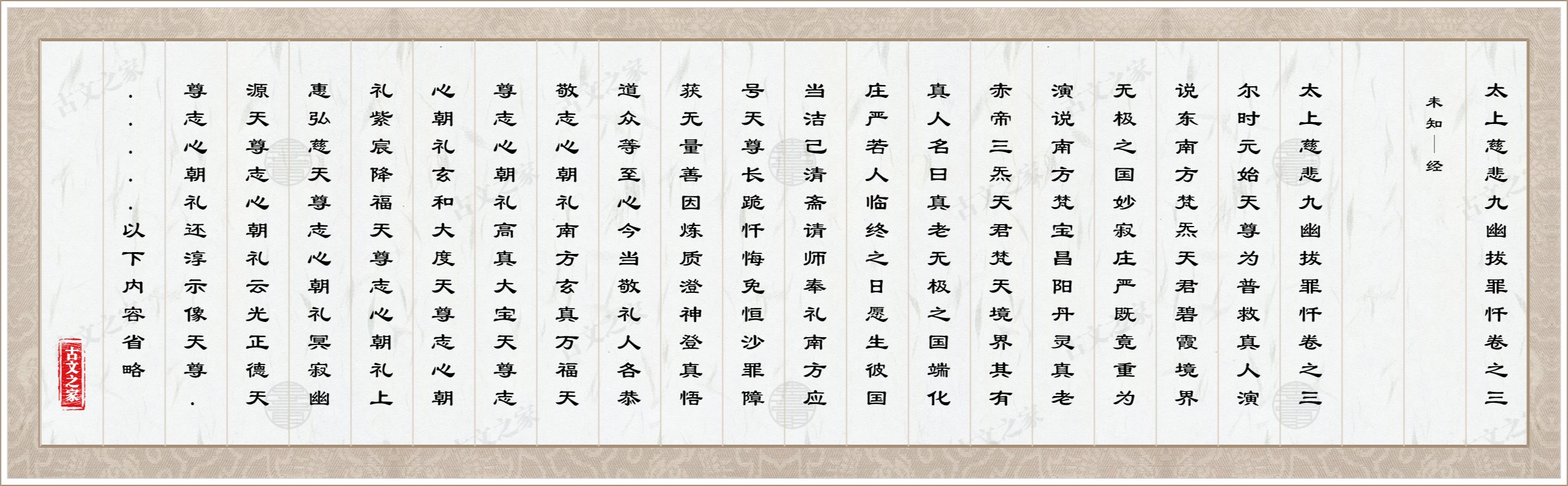 天尊言,若有善男子、善女人,从生至死,毁坏尊像,损破道场。或剥脱行人及出家法身。或破诸禁戒,啖荤血之徒,五逆生心,合舌为本,诽谤三宝,嗔怒慈亲。或弃贱憎贫,背夫逐妇。或造私润己,背正入邪,同炁不亲,交游益重。或用三宝物,无有愧心,贷债弥多,抵赖不少。或杀生偷盗,不信公途,向暗背明,欺存誷殁。或骂詈良善,凌突贤人,淫欲恒多,阴毒不息。诸如此罪,尽系冥关,不有忏扬,将何消荡。若有善男子、善女人,常行孝心,旦暮不怠。或为父母,或为九玄,或为交亲,或为血属,或为兄弟,或为己身,舍施资财,请师礼忏,精羞供养,严洁道场。或八节三元、五腊十直、七元本命、岁旦庚申,是此良辰,或持斋戒,可除八难,能去千灾,一切冤家,成恩洗雪。先亡离苦,久远生天。地狱停酸,幽关水闭。愚痴晓了,六疾痊平,涉历四时,不罹灾衅。汝等男女,各自慎行,兢兢在心,勿生厌倦,即逢善果,遇此因缘,忏悔既终,斋心敬礼。
