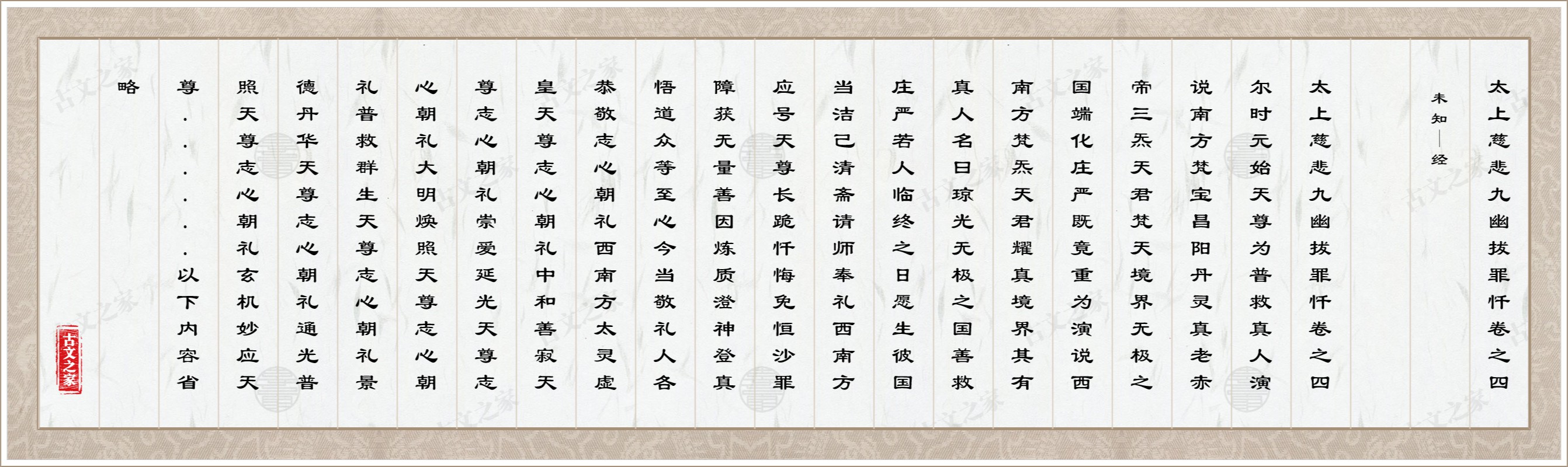 至心归命,十方常住三宝。臣等忏悔口业,无量之罪。或曾欺贤誷圣,毁道憎亲,谈讟他非,矜夸己是,呵风骂雨,恶暑厌寒,翻有为无,将粗作细,斗合良善,扬举愚痴,从口而生,为罪之本。诸多过咎,无量无边。今日向十方天尊前,洗心丹祷,归命忏悔,咸乞荡除。天尊言,若有善男子、善女人,一为天地,二为帝王,三为父母,四为众生,五为血属,六为己身。爰从受生已来,至于今日,自一岁一十、二十三十、四十五十,乃至百岁、百二十岁,必欲预修,还从一七、二七、三七、四七乃至七七、百日、周年,周而复始,乃至永年,所造功德,还依次第而作,第一造像,第二写经,次即造四十九尺长旛,设四十九人斋,安置道场,请诸尊像,并及法师,香火知识,燃四十九灯,照耀诸天,其灯为三层台,下阔上敛,圆转状如车轮,香华供养,随力丰俭,三日三夜,或七日七夜,倾心丹祷,忏悔虔祈。对三宝称扬,为先亡首过,言词惟在朴实,不得浮华,务彼精严,必彰福利。其次广赎生命,或百或千,随其多寡,亦不可得。其次伤悯贫穷下贱,不具足者,旅困羁栖者,病人孤老者,囚徒饥馁者,边鄙愚顽,不晓东西。无分善恶者,咸堪救度,使沐良缘。或值他方远客,有急依投,而为开度,济其厄难,救彼孤寒,悉令安乐,此亦荐导亡灵,其福最大。其次为先亡父母、亿劫种亲,写造三十六部尊经,任意多少,或一部、十部、百部乃至千部,随力多少,拔度魂神,其福无量。使见存利益、过往逍遥,汝等男女,悉当谛听,宜各奉行。