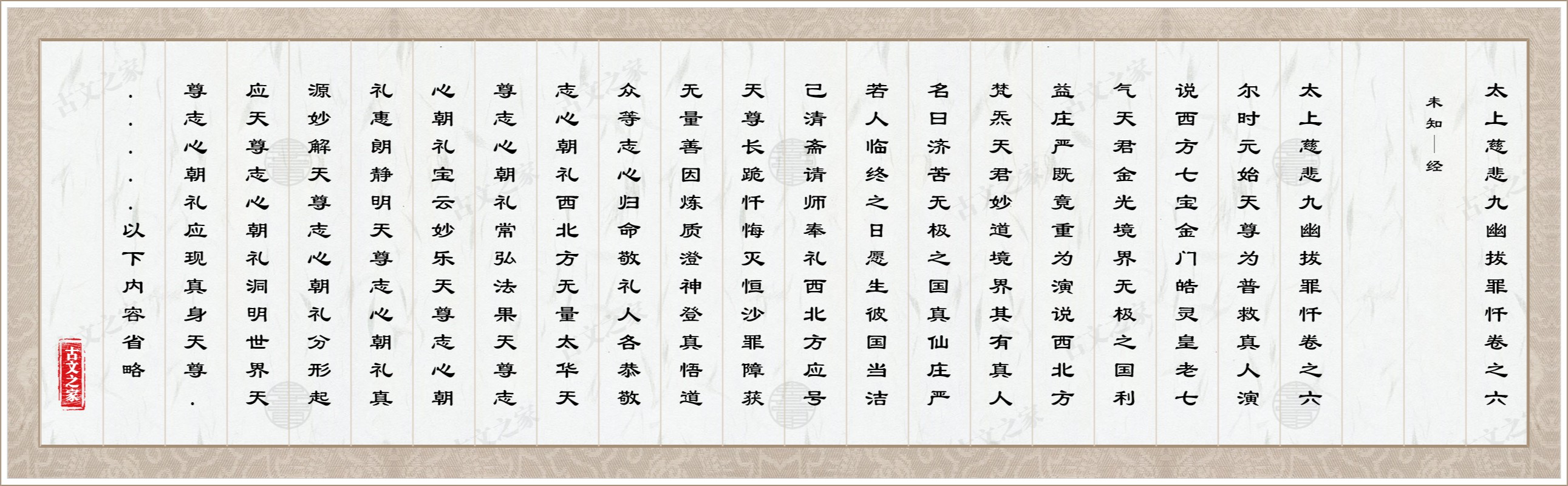 志心归命,十方常住三宝。臣等忏悔六根之罪。自从诞育身形,染诸尘浊,眼观五色,鼻齅五香,耳滞五音,口贪五味。笼一身而昏昧,造众罪以交罗。积集愆尤,标题簿籍,遂使生逢祸难,殁受辛酸,须凭众圣之功,用涤九幽之苦。今日洗心归命,面对天尊,忏悔所造之业缘,愿冀当来之善果。於是,天尊复告道君言,此去之后,当为一切存亡众生,造诸经忏。种种功德,皆有次第。若有众生,得吾此经,香汤扫洒,沐浴身心,着鲜洁净衣,烧香燃灯,旛华宝盖,周匝围绕,礼拜供养,欢喜踊跃,长跪叉手,护净精进,受行读诵,坚持敬奉。为诸人天未闻之者,皆悉遣闻;未见之者,皆悉遣见。若有善男子、善女人,舍施资财,请师礼忏,纵有黄金如昆仑山大,遍满天地而将布施,其功甚大,犹复不如方便教人,一句一偈,经言永为身宝。黄金虽贵,不保我身;此经虽微,生死同果。汝等男女,勿生痴故,吝此黄金,竟为爱惜,不修功德,与身为患,必无利益,即是烦恼,永被煎烧。若能周帀,作此功德,见世过去,一切宿罪,悉皆除灭,所在之处,快乐逍遥,净土十方,随心愿往。若有出家供养三宝,如斯功德,不可思议。诸众生等,既闻经已,稽首作礼,瞻仰尊颜,肘行膝步,擎拳叉手,尊奉至道,昼夜精虔,诚心忏悔。稽首十方,常住三宝。