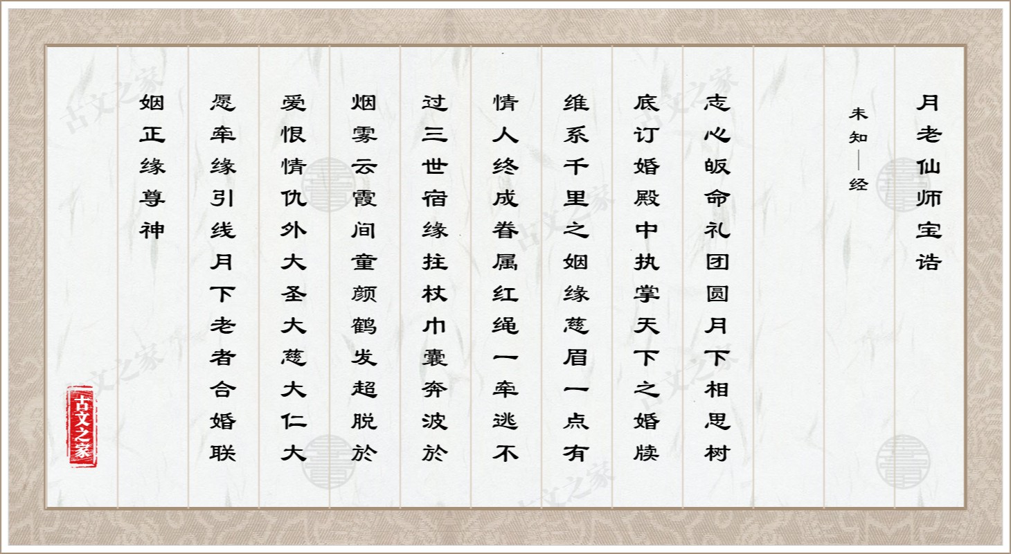 志心皈命礼。团圆月下,相思树底,订婚殿中。执掌天下之婚牍,维系千里之姻缘。慈眉一点,有情人终成眷属。红绳一牵,逃不过三世宿缘。拄杖巾囊,奔波於烟雾云霞间。童颜鹤发,超脱於爱恨情仇外。大圣大慈,大仁大愿。牵缘引线,月下老者。合婚联姻,正缘尊神。