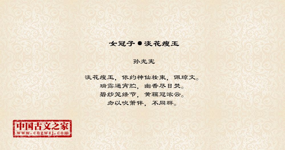 淡花瘦玉,依约神仙妆柬,佩琼文。瑞露通宵贮,幽香尽日焚。碧纱笼绦节,黄藕冠浓云。勿以吹箫伴,不同群。