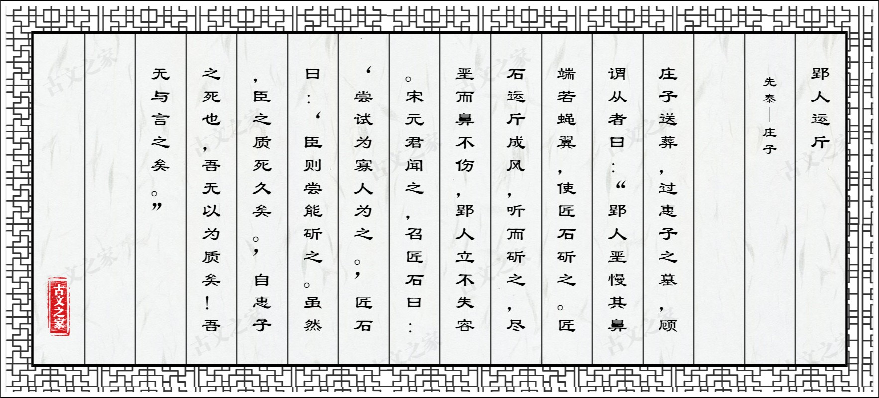 郢都有一个人,不小心让一星点白灰粘在鼻子上,这点白灰就像苍蝇的翅膀那样又薄又小,他让石匠替他削掉。