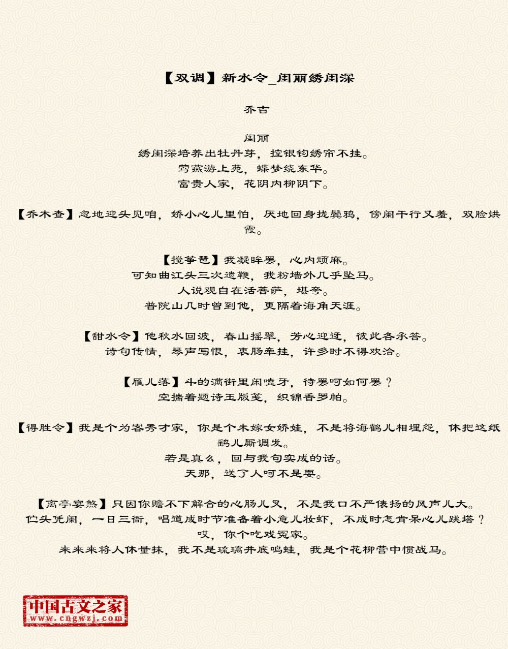 乔吉(1280~1345)元代杂剧家、散曲作家。一称乔吉甫,字梦符,号笙鹤翁,又号惺惺道人。太原人,流寓杭州。钟嗣成在《录鬼簿》中说他“美姿容,善词章