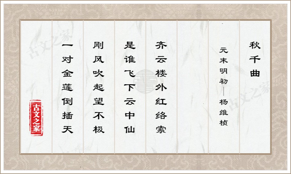 齐云楼外红络索,是谁飞下云中仙?刚风吹起望不极,一对金莲倒插天。