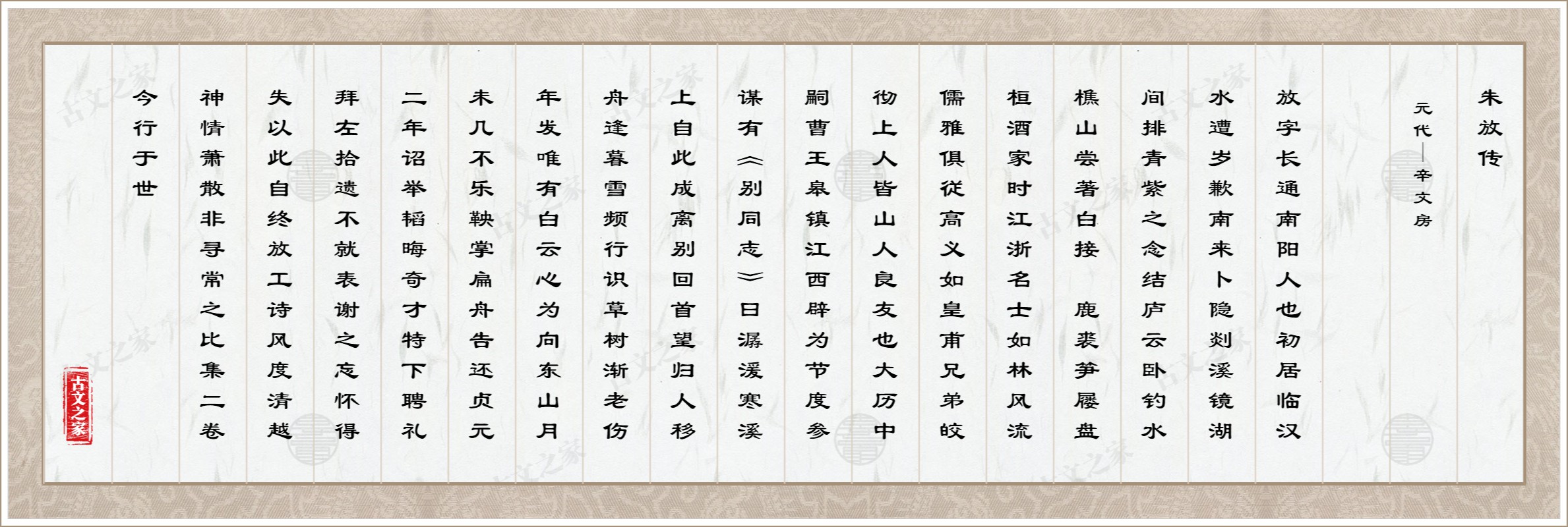 放,字长通,南阳人也。初,居临汉水,遭岁歉,南来卜隐剡溪、镜湖间。排青紫之念,结庐云卧,钓水樵山。尝著白接,鹿裘笋屦,盘桓酒家。时江浙名士如林,风流儒雅,俱従高义。如皇甫兄弟,皎、彻上人,皆山人良友也。大历中,嗣曹王皋镇江西,辟为节度参谋。有《别同志》曰:潺湲寒溪上,自此成离别。回首望归人,移舟逢暮雪。频行识草树,渐老伤年发。唯有白云心,为向东山月。未几,不乐鞅掌,扁舟告还。贞元二年,诏举韬晦奇才,特下聘礼,拜左拾遗,不就,表谢之。忘怀得失,以此自终。放工诗,风度清越,神情萧散,非寻常之比。集二卷,今行于世。