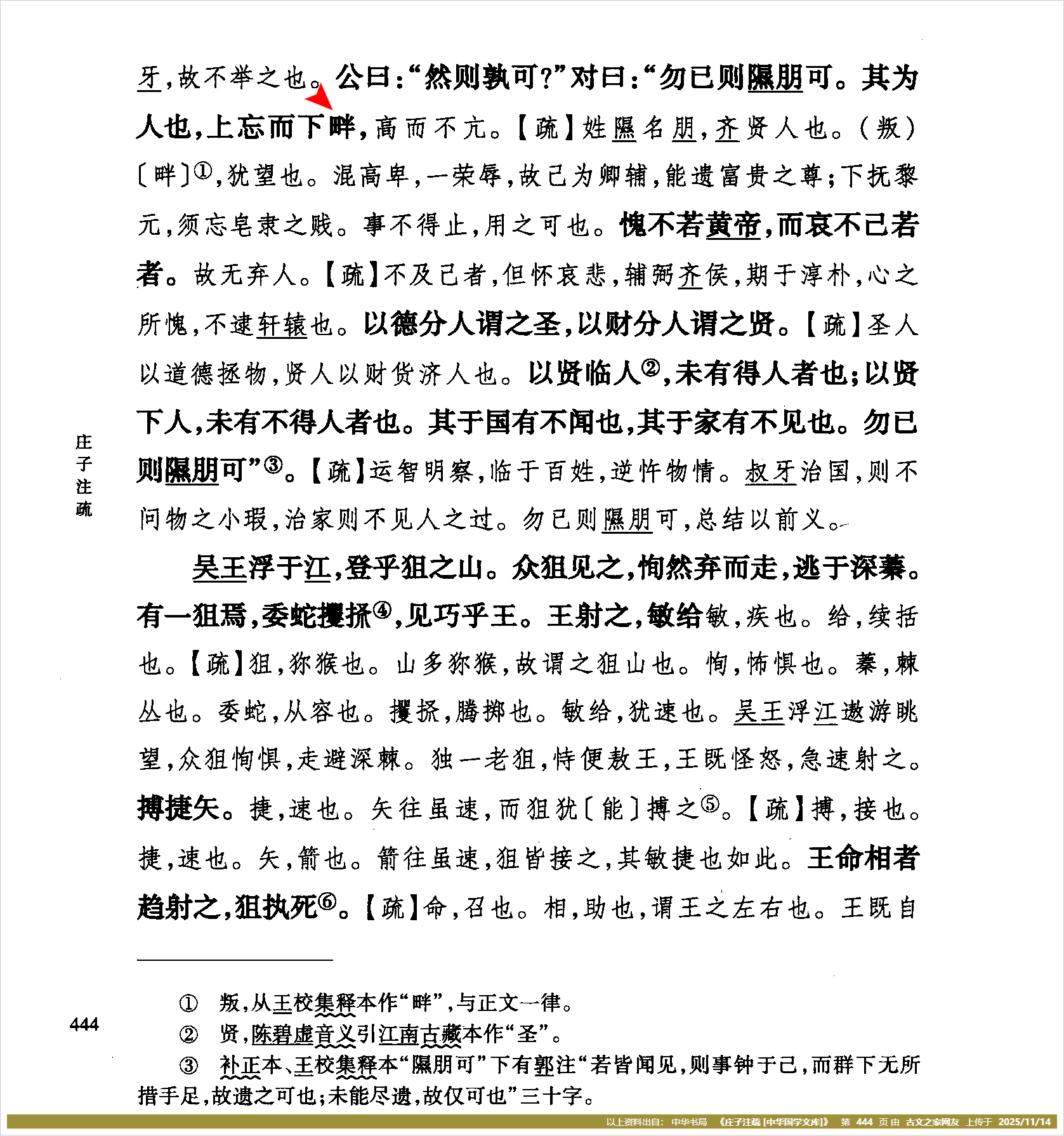 【第4_1楼】可参照中华书局的《庄子注疏 [中华国学文库]》第(433)页 ,内容。非常感谢来自热心读者{:1.81.*.*}的纠错指正,经过我们的人工核对,本文已对相关内容进行了更正。再次感谢您为本文注音所作出的贡献。