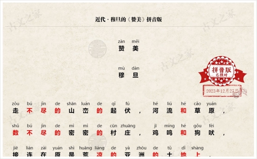 拼音全文:(我们坚持对每一篇古诗文进行人工查证并注音、我们亲自查证并回复来自您的每一次纠错,只为给您一份更为准确的拼音版本,请记住我们:古文之家)