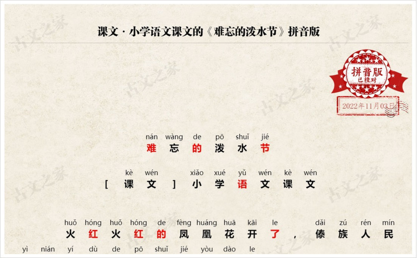 《难忘的泼水节》拼音版,可打印PDF文档下载小学语文课文