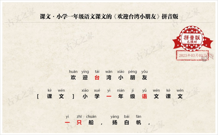 《欢迎台湾小朋友》拼音版,可打印PDF文档下载小学一年级语文课文