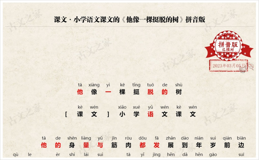 《他像一棵挺脱的树》拼音版,可打印PDF文档下载小学语文课文