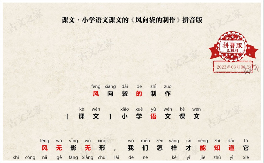 《风向袋的制作》拼音版,可打印PDF文档下载小学语文课文