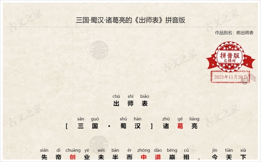 译文:现在南方已经平定,兵甲已经充足,我应当勉励统率三军,北定中原,以便竭尽我拙劣的能力,扫除奸邪、兴复汉室、返还旧都。