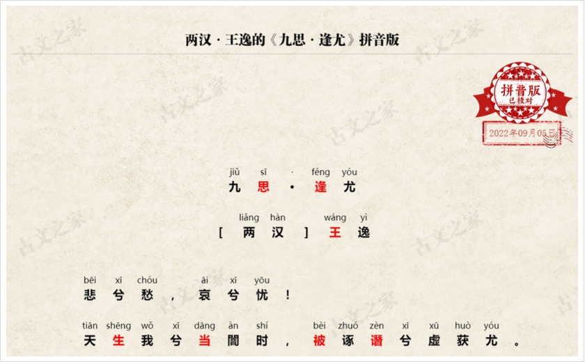 拼音全文:(我们坚持对每一篇古诗文进行人工查证并注音、我们亲自查证并回复来自您的每一次纠错,只为给您一份更为准确的拼音版本,请记住我们:古文之家)